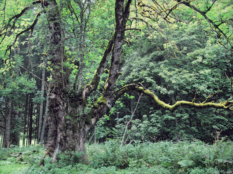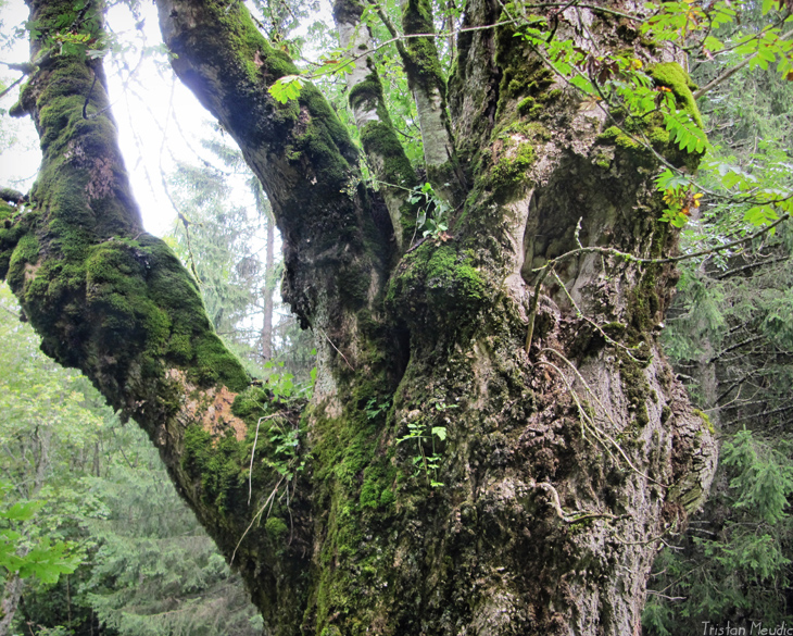 L’arbre semble encore relativement vigoureux malgré son aspect délabré. De nombreuses plantes épiphytes, dont un petit épicéa et un gros sorbier des oiseaux, y ont élu domicile.