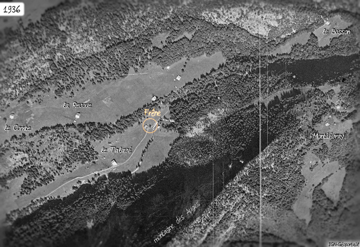 4) Le chemin déviait légèrement côté chalet et devait alors être directement contigu au frêne (photos aérienne de l’état Major – IGN). Voir le cadastre de 1870.