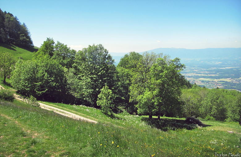 Tout au long du chemin et face à la vieille bâtisse un panorama superbe s’offre à vous: une vue à 180° sur le Genevois, d’un côté le Léman, de l’autre le Vuache, et en arrière plan les lignes douces du Jura caressant l’horizon.