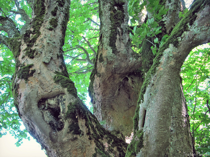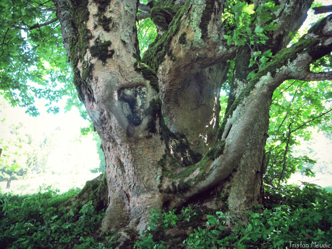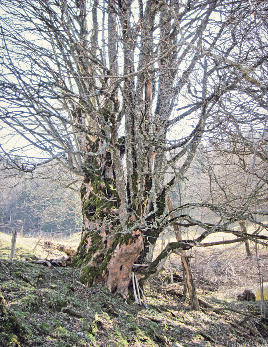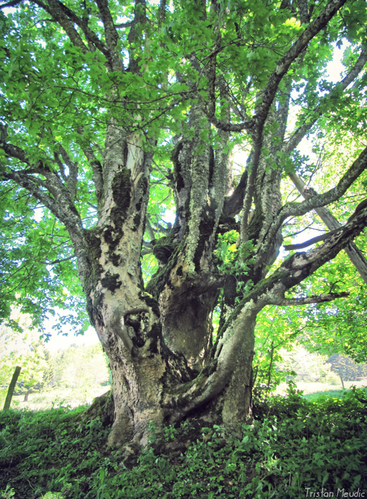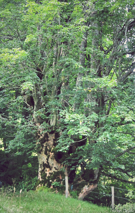 Acer pseudoplatanus est une espèce qui peut dépasser les 200 ans, voire exceptionnellement 300. Quelques arbres auraient même franchi les 500 ans. J’aurais toutefois bien du mal à donner un âge à notre érable. Peut-être entre 200 et 300 ans, difficile à dire…