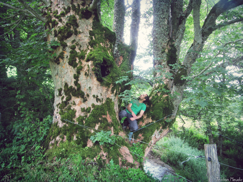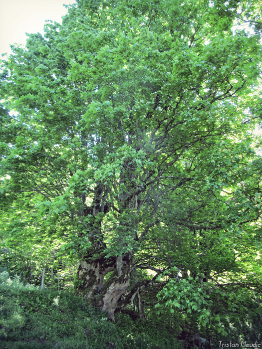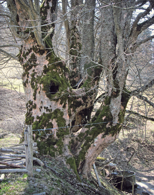 Malgré des mensurations record(4) cet érable se fait pourtant discret. En amont, depuis le chemin de la Thuile, on pourrait penser avoir affaire à un groupe très compact de plusieurs arbres. Ce n’est qu’en aval du vieil érable, le long de l’ancien chemin qui reliait cet alpage à celui des Convers, que sa puissance se dévoile…