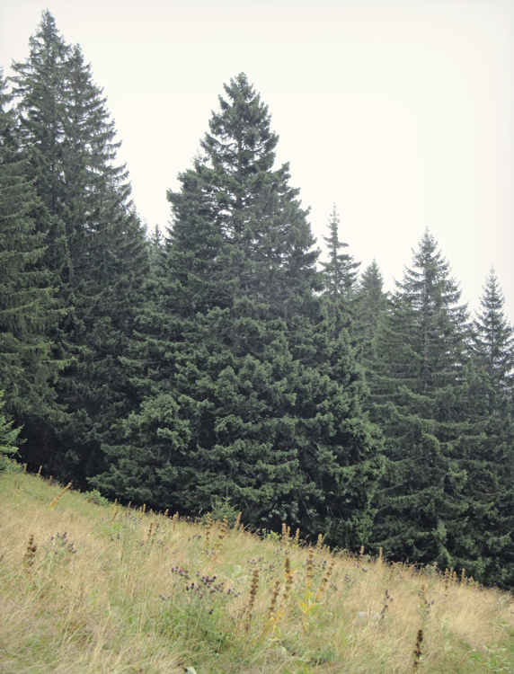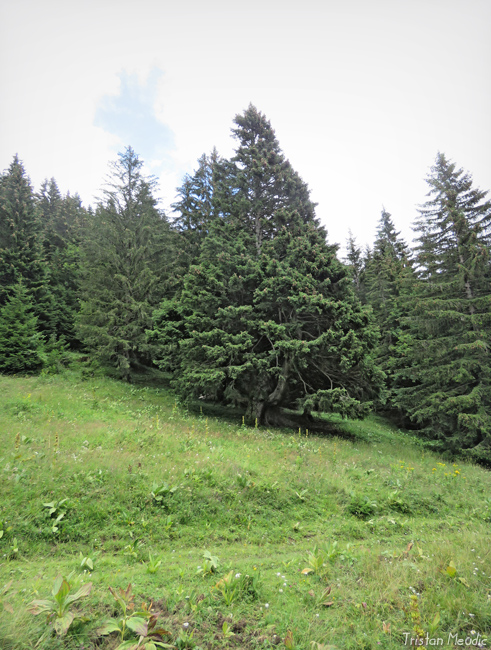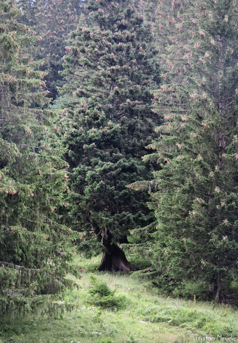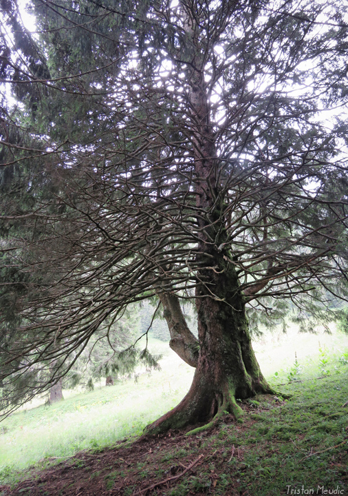 La dernière section du trajet pour atteindre le pic Blanchard, boisée, aux allures de forêt primaire drapée d’un voile de brume, était particulièrement plaisante, mais aucune découverte particulière. J’allais donc revenir bredouille quand au retour, au niveau du chalet de Corniens, au bénéfice d’une éclaircie momentanée, j’aperçois un arbre qui m’intrigue. De loin et avec une visibilité médiocre j’ai d’abord cru à un gros sapin (l’aspect général différait des épicéas alentour, en particulier au niveau des extrémités émoussées des rameaux sur les 2/3 de la hauteur qui, visuellement, tenaient plus du chou-fleur que de la draperie pendante habituelle chez l’épicéa) et j’étais excité à l’idée de découvrir un vieux Gogant.