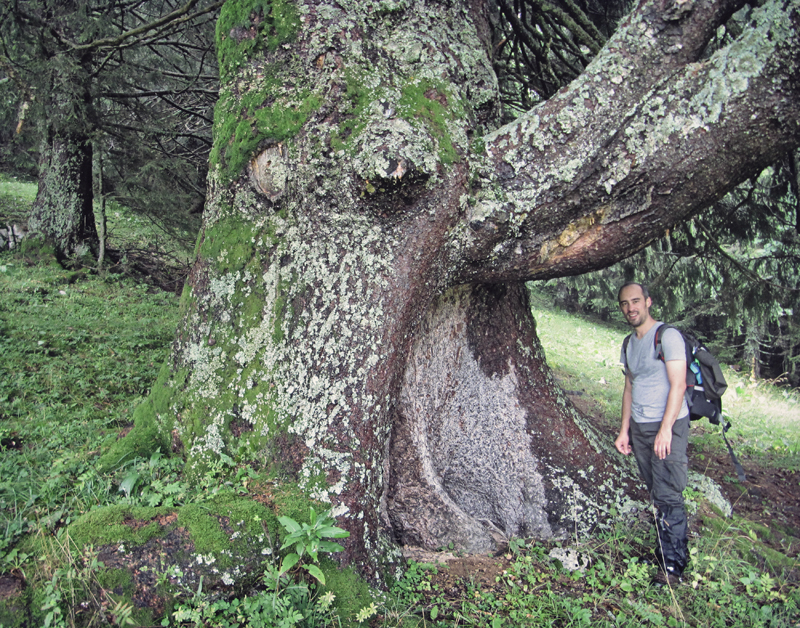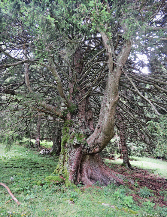 Les arbres situés en terrain accidenté ou en alpage, peu élevés, aux formes souvent biscornues, inexploitables, ont eux tout loisir de vieillir à l’abri de la hache.